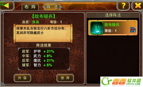除了阵形,游戏内也提供了各种阵法。阵法能对每个位置上的武将提供一定的属性加成或者其他特殊效果。不同的阵法对不同的阵容搭配将起到完全不同的作用。