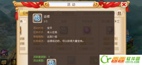 任务描述:在长安镖头(29.51)领取任务,运送货物,运送成功获得银币和活跃度奖励。