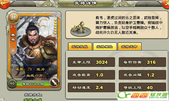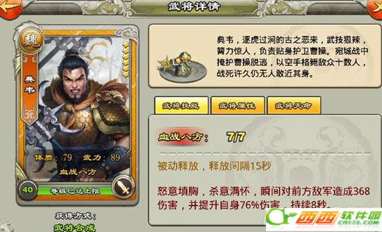 典韦开启技能时,能够先击杀武将附近的刀盾与弓箭手,为典韦全力击杀对方进攻武将创造了条件。同时76%的伤害加成,使得他在遭遇多数六星与少数七星武将的时候都能将其斩落马下