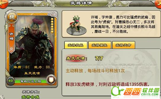 优势:1.3发1395伤害的虎啸蛋使得许褚能够成为击破1级炼狱塔及大部分防御建筑的有力武将
