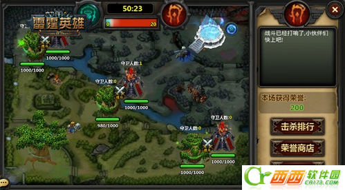 战场中双方各有上中下三个防御塔,玩家可选择其中一个与对方守卫军战斗,胜利后对方防御塔血量下降。战斗中一方的两个防御塔血量为零则失败,战场结束,若时间结束未分胜负,则战场得分较高一方胜出。