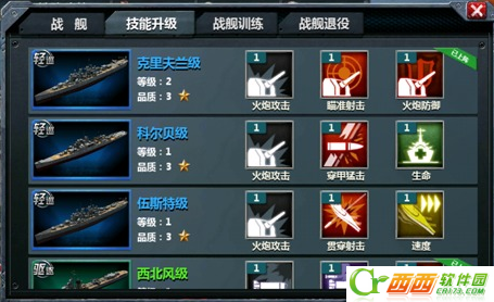 每艘舰船最多可有三个技能,其中普通攻击技能一个,主动攻击技能一个,旗舰技能一个(部分舰船无旗舰技能),所有类型的技能均可以进行升级。每个技能升级时消耗一定数量指定的道具,使用该道具后根据一定概率会有两种结果:技能升级成功、技能升级失败但熟练度增加。