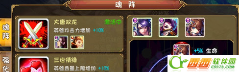魂阵“大唐双龙传”若魂色吻合,则玩家可以获得10%攻击力+5%外防+7%生命加成。但因为少年寇仲的魂色为橙色,与红色阵位不符,所以7%生命加成未激活。