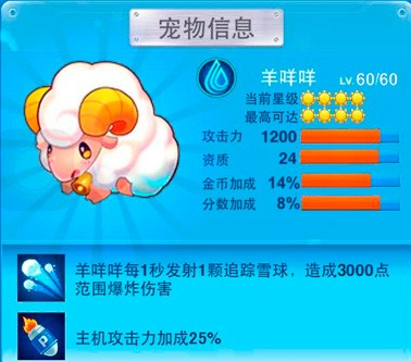 冲击雪球:羊咩咩每1秒发射1颗追踪雪球,造成3000点范围爆炸伤害。
