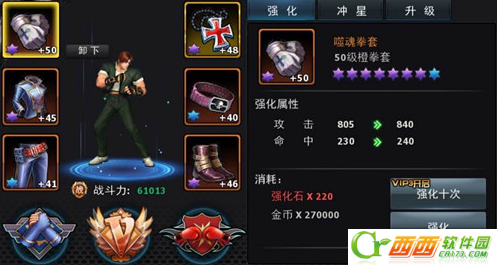 装备增强,在目前拳皇97OL版本中有3个元素,第一装备强化,第二装备升星,第三装备升级。可以超大幅度的提高角色战斗力,在游戏中对于战斗力的影响是极大的。