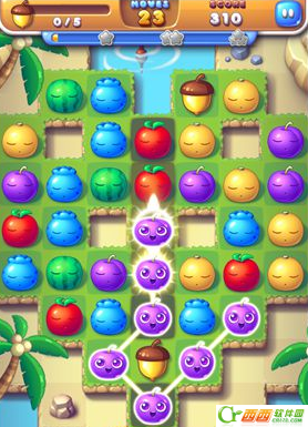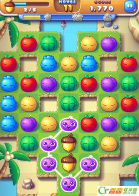 1.游戏开始,玩家可以观察到本关地图底层只有一个位置,因此玩家要做的就是将榛果的位置全部移动到中间的位置,再将中间的所有水果都连接消失掉即可。