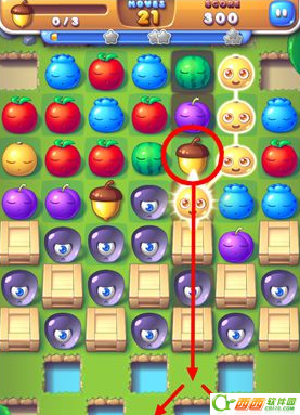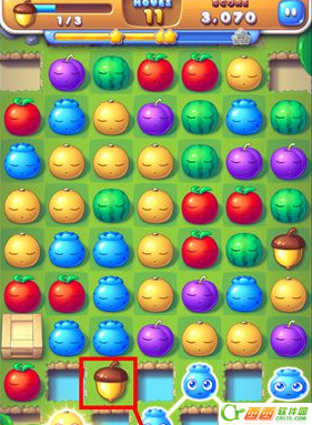 2.接下来玩家要做的就是尽量获得7个以上的水果,让出现能消除整行的水果连接到榛果的同一竖行,进行消除以后,如图所示榛果会直接落到底下即可获得。