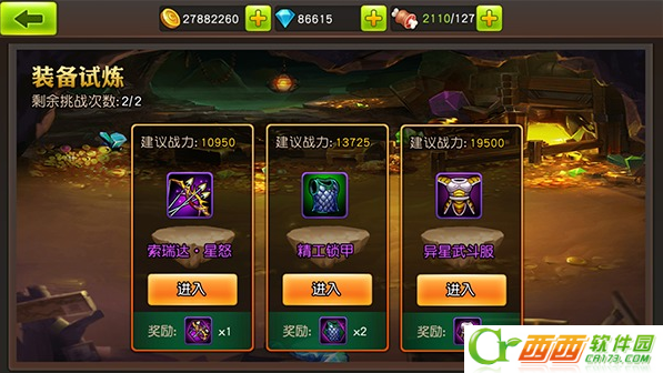 ”装备试炼“每天刷新三个关卡,每个关卡对应不同的装备,挑战胜利后可获得对应装备的碎片,高品质BOSS的挑战需要更强的实力,与之对应的奖励当然也是高品质装备的碎片,实力与奖励成正比,快来加入挑战!