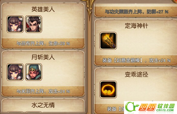 《盗梦英雄》在新手引导任务中将会以奖励的方式发放功夫熊猫和美杜莎给玩家,还有12级开启活动系统时送传说级别的孙悟空。这时候已经出现缘分搭配了,没错,就是猴哥和熊猫,虽然加成只是单向给猴哥享受,但是27%防御的加成给前排输出的猴哥也是大大的增加输出时间啊。另外,第二天登录活动将会获得猴哥的专属橙装武器金箍棒,装备缘分加成24%,瞬间战斗力爆表啊有木有!!
