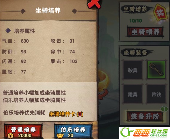 42级开启,培养后可增加坐骑属性,培养分为铜钱培养和元宝培养两种,每天都可以培养10次。培养满10次后还会获得额外赠礼哦。