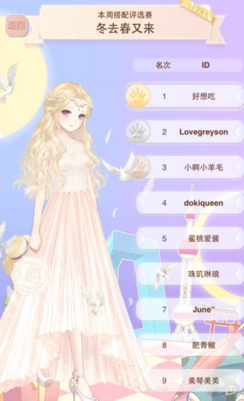春天就是各种鲜花绽放,带有碎花的连衣裙也是很符合主题的,北欧女神的长发也很适合,复古时光机或者春之花园都很合适,也可以刷到很好的名次。