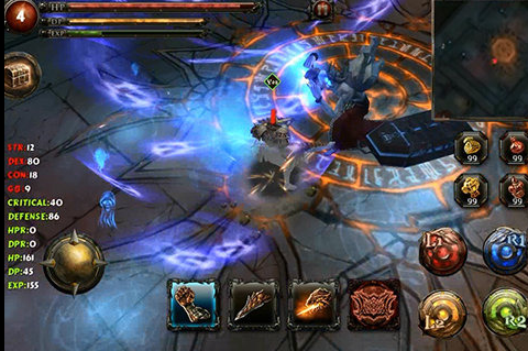人物页面右侧可以查看商店、装备库、技能,右下角手臂样式的图片,是切换武器的键,按此键可以自由切换武器(基本、剑盾、锤盾、火焰、狂暴、巨剑)。每当举行一次副本就会消耗一点体力,当没有体力的时候就无法继续进行游戏。但是小伙伴们不要担心,每十分钟就可以恢复一点体力,让我们再次尽情暗黑战斗。