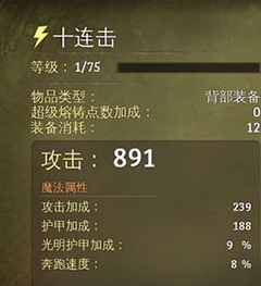 十连击是个光明盾装备,在背部装备中算是很给力的。技能效果对单体或多对手进行连续十次飞速攻击,攻击期间对手将会被控制定身,自己处于无敌状态,所以说十连击是很强力的背部装备,可以升到5星那才超级给力。