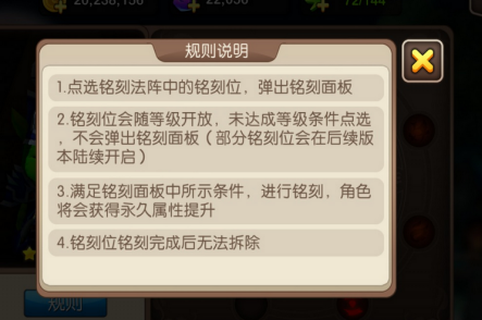 具体的规则如图所示,我们可以看到铭刻带来的属性提升是永久而且不可逆的,这点和宝石不一样,不能说铭刻好了某个位置之后还能拔下来,因此这就需要我们去谨慎地选择英雄以及铭刻的顺序。合理适当的铭刻,才能最大程度强化自身战斗力。
