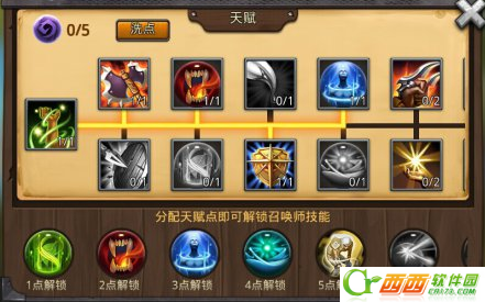召唤师技能是需要天赋点解锁的,召唤师每使用一点天赋点数,即可解锁一个召唤师技能。召唤师在进行副本讨伐或PK的时候可以在已解锁的技能中选择一个携带助战。