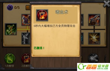 “嗜血”6秒内大幅度增加己方全员物理攻击,2点解锁。