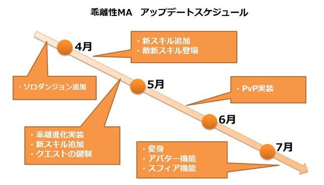 单人副本追加、新技能追加 敌人新技能登场、乖离进化实装 新技能追加 副本的锁制、PvP实装、变身 虚拟人物功能 sphere功能。将依次上线