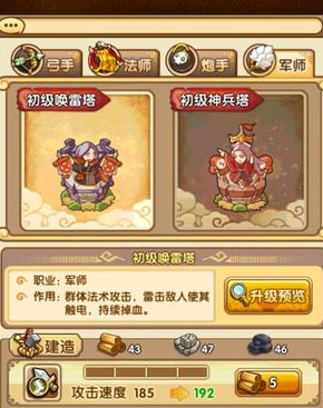 4、军师:军师拥有唤雷塔和神兵塔,前者持续掉血,后者降低法抗,由于军师造成的是法术伤害,并且是群体,所以降低磨抗在后期远比掉血的性价比要高很多,所以建议升级神兵塔。