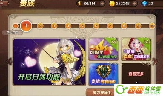 独特的贵族系统,可以让玩家拥有更多的属性加成,从而让闯关更加轻松,更有扫荡功能和副本经验加成等福利。