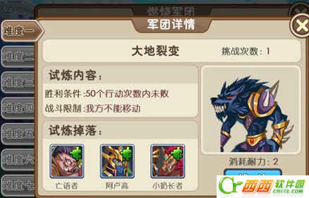 在燃烧军团的玩法中,大地的裂变会在每周的双数日开启,更适合魔法队伍作战。随着人物的升级,可以解锁不同的难度,消耗耐力获取怪物卡,可以取得的卡牌在图片中给的左下角。