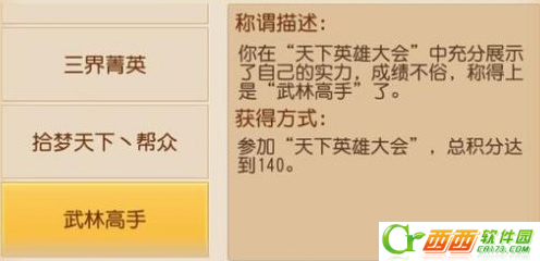 称谓描述:你在“天下英雄大会”中充分展示了自己的实力,成绩不俗,称得上是武林高手了。