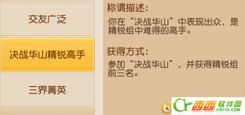 称谓描述:你在“决战华山”中表现出众,是精锐组中难得的高手。