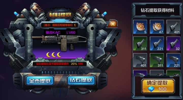 另外,提取功能分为“金币提取”和“钻石提取”两种方式,使用钻石提取可比金币提取获得更多的材料。钻石提取的材料是不是更丰富呢。