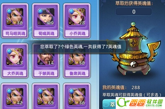 搞懂了英魂在哪能凑齐,接下来的英魂值可没那么复杂。英魂值为所有武将通用,且只能通过“英魂萃取”系统获取。打开武将升星界面,在武将英魂数量栏右边就是英魂值数量栏(当前拥有英魂值数量如未达到升星需求,会以红字显示),点击英魂值数量栏“+”号按钮可进入英魂萃取界面。