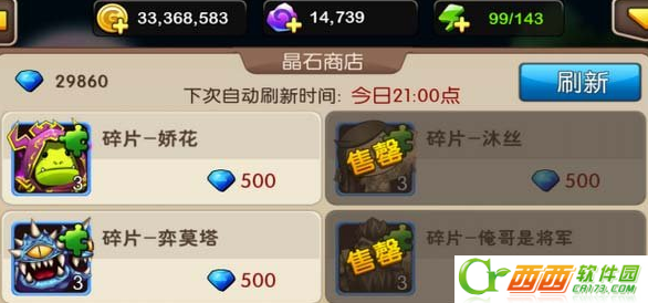 图(1) 大家可以看到,这个图是外域的晶石商店,此时已经有四个英雄了,娇花,幕斯,双头狗和俺哥,第一个娇花,我建议大家还是放弃培养,为什么呢?因为个人看法就是娇花和虐人的性质差不多,都是送能量的货,竞技场根本上不了场,大招也容易被打断,这是用本区83级的小号尝试了的,太怂,不建议大家培养。第2个是幕斯,这个人物呢,之前也是没有培养的,就是在打75级的外域的时候把他升到了56级,然后带上四级宝石打外域,这个我建议大家要持续换他的碎片,因为后期的试炼塔全靠他的盾了,第三个人物就是双头狗了,这个人物怎么说呢,从开始换他起就没用过他,任何时候都没有用过他,只是把他换到五星就放着了,这个人物大家换到五星及可,最后这个俺哥是将军,大家是必须换的,因为之前没换俺哥,导致刷新38次,花了几万晶石把他弄到五星,这个人物在竞技场几乎每个人都带了,所以我建议大家每天都换,到了五星继续换,因为每天在换,已经五星了,还有100来个碎片,为后来的铭刻做准备!