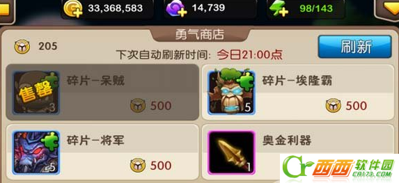 图(2)这个是竞技场常规战的勇气商店,建议只换呆贼碎片,因为在没有树人和将军的情况下,每天都可以打到竞技场前20,呆贼五星了也要继续换,因为还有铭刻,我建议大家不要拿体力去刷呆贼碎片,因为真心不好刷,试过的应该都知道,也别用勇气值去买那个铭文,因为你买你就会发现,你亏大了!