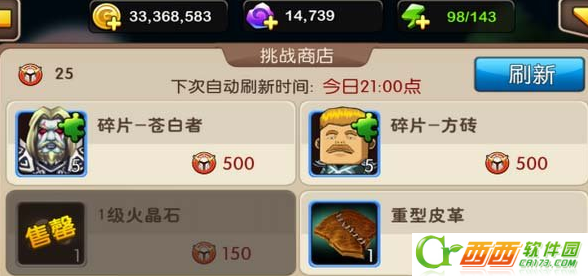 图(3)这个是挑战赛里的商店,我给大家的建议是全部刷新买一级宝石,没有苍白者和方砖,但是也没有换这两个人物,因为感觉太脆,特别是苍白者,老是被的呆贼秒噢!现在公会本也不爆2级宝石了,所以我建议大家换宝石!