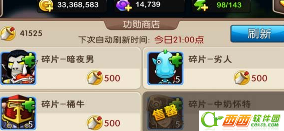 图(4)就是冰峰王座的功勋商店了,这里我要给大家的建议就是,不要去换那个暗夜男,因为用83的小号,花了3万晶石把他弄到5星紫+1技能全满,试了一晚上,真心太弱,打什么队伍都不好打,所以我建议大家还是别换了,功勋留着,期待像呆贼这样的人物进入冰峰商店,虐人到了五星就止步吧。至于桶牛,一个碎片也没有换,中奶这个是必须换的,因为现在正在铭刻她。大概明天就可以满了,所以我建议大家要持续的换中奶,直到铭刻满了为止!