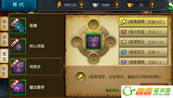 打开宝石界面,选中你想要镶嵌的宝石,选择空的宝石孔,点击“镶嵌”按钮就可以镶嵌宝石了,镶嵌宝石是免费,但摘除宝石是需要花费银两哦!