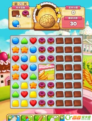 此关的目标则是要消除24个巧克力和12个甜甜圈以及15个蓝色曲奇,所能用的步数仅仅是30步,不过按照自己的发现,这关步数不用剩下太多都是可以三星的。