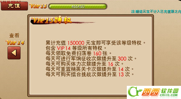 征收次数增加,购买体力次数增加,重置精英关卡次数增加,擂台挑战次数增加,一骑当千次数提高,过关斩将次数提高,解锁神秘探访功能,神秘商店等。