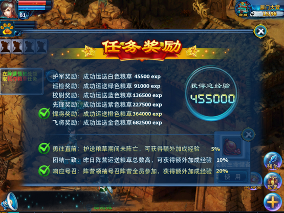 [完成任务]:根据玩家本次运送粮草的过程,会结算不同程度的奖励。
