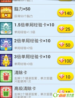 脑力达人作为一款问答类型游戏,如果完全是钻石买答案的话其实游戏乐趣就会少很多,而中的道具主要是1.5倍经验卡、2倍3倍单局经验卡、清除卡,经验卡可以再我们单局结算的时候增加经验,而经验是我们账号等级的基础,清除卡可以去掉错误答案,让玩家在考虑过后还能学到少量的冷知识。