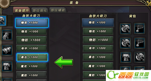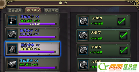 右侧为背包中的装备,每一个装备都会显示一个增加经验值的数值,点击右侧的装备进行选中,然后点击选择左侧要强化的部位,最后点击强化,所有被选中的装备都会吞噬给左侧选中的部位,对应的部位将会增加对应的经验值,当经验值达到升级要求时,会为对应的部位永久增加相应的属性。