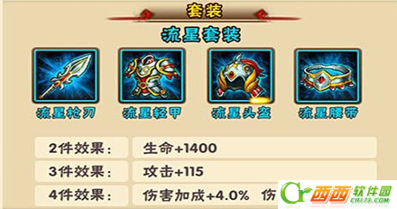 蓝色的装备是以流星开头的,那么这也是套装,分别有流星枪刃,流星轻甲,流星头盔以及流星腰带。那么玩家集齐2件,便会有1400点的生命加成,如果集齐3件,那么会有攻击115点的加成,如果集齐全套,那么会有伤害4%和免伤4%的加成。