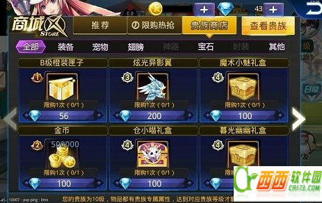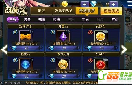 贵族6级:想体验布鲁这个角色吗?6级贵族满足你,可以让你对这个角色有所了解。A级橙装匣子仅需600钻。升星石、体力药片!贵族商城新增每天都可2折购买!升星石200个仅需20钻,而5个体力药片也仅需20钻。