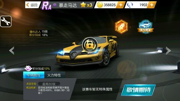 赛车属性:最大速度426KM/h、加速度12.8Km/s、节油效率33.6Km、金币加成+5.5%、重量630Kg、变道速度+5.5%、里程分加成+5.5%、
