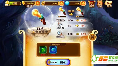BB枪,攻击力一般,但攻击间隔时间较短。目前等级lv20级,攻击力达173,攻击间隔0.9秒。