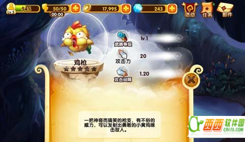 鸡枪,一把神奇而高效的枪支,有不俗的威力,可以发射出永安的小黄鸡啄击敌人。初始攻击8,攻击间隔1.2秒。