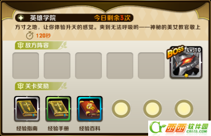 在英雄学院中,玩家有120秒的时间去承受Boss的攻击,在英雄学院中坚持的时间越久,获得的奖励也就越多,成功坚持到倒计时结束后,会获得额外的奖励,所以建议玩家选用防御较高和能够加血的角色来组成队伍哦。