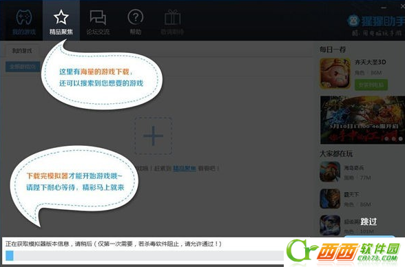 第二步,自动打开猩猩助手并下载模拟器,仅此一次,若杀毒软件阻止,请允许通过!
