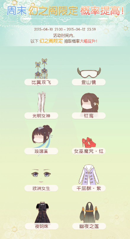 暖暖环游世界的百美图活动进行的如火如荼的时候,可不要忘记又是周末到来,说明幻之阁限定的活动就要来了,本次周末的【幻之阁限定概率提升】依旧是带来了10件概率提升的物品,而由于百美图的活动,暖粉们的体力紧张,所以本周的【限时定制】活动暂停,大家不要忘记周末在暖暖中领取体力哦。