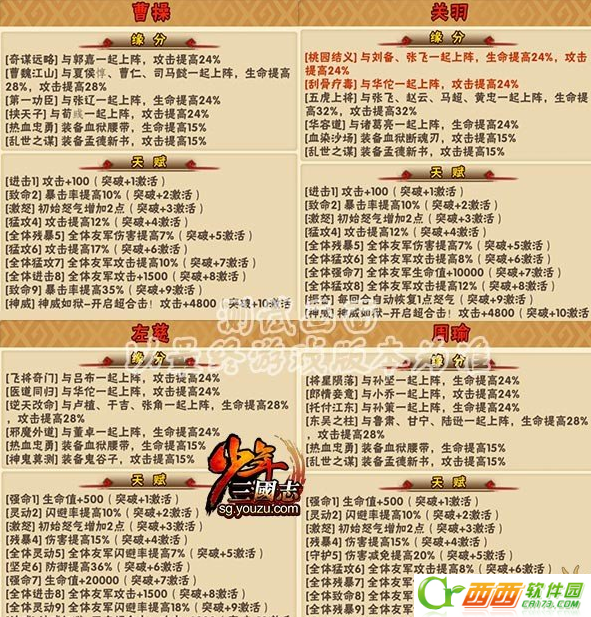 少年三国志曹操周瑜缘分解析,关羽左慈缘分解析,最新出现的红将也不是完全独立的哟,他们的缘分还是可以和部分老牌橙色武将有关联的,而这些缘分会带来什么样的属性提高呢?下面咱们一起来看。