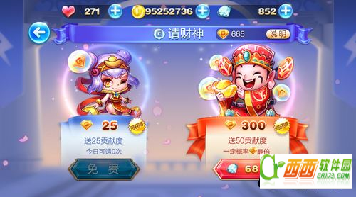 在第一张图片我们看到最左边有一个请财神图标,点进去就可以看到获得对战币途境,现在开放只有两种,一种为每天早8点更新一次的免费请财神,每天可为俱乐部贡献25,还有25对战币收入;一种为钻石购买,一次要68钻石可以得到50贡献和300对战币,小编我是等不了每天25都不知要什么时间才能得到,所以果断花钻钻,共购买20次68钻的请财神有4次双倍对战币,这个概率还是不错的哦。想要快速得到大黄鸭的同学可像我一样,果断出手。