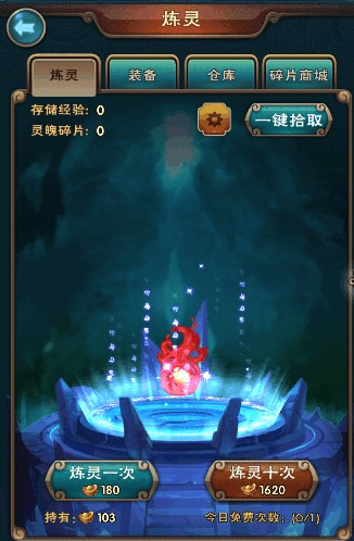 每天可免费炼灵一次,单次炼灵180元宝,炼灵十次1620元宝。一键拾取会自动把经验之灵转化为经验,其它炼灵自动放入仓库界面,每次炼灵会获得一个灵魄碎片,可在碎片商城换取需要的灵魄。