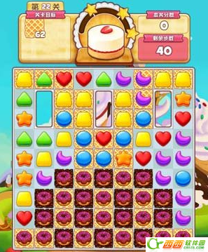 碎碎曲奇22关3星攻略,碎碎曲奇22关拿高分技巧,由于本关给了一个可以快速合成彩虹蛋糕的机会,所以就难度上来说相对低了一点,但麻烦的还是最上面的曲奇不好消除,因为有空格挡着,接触面少就只能用特殊曲奇来轰掉了。